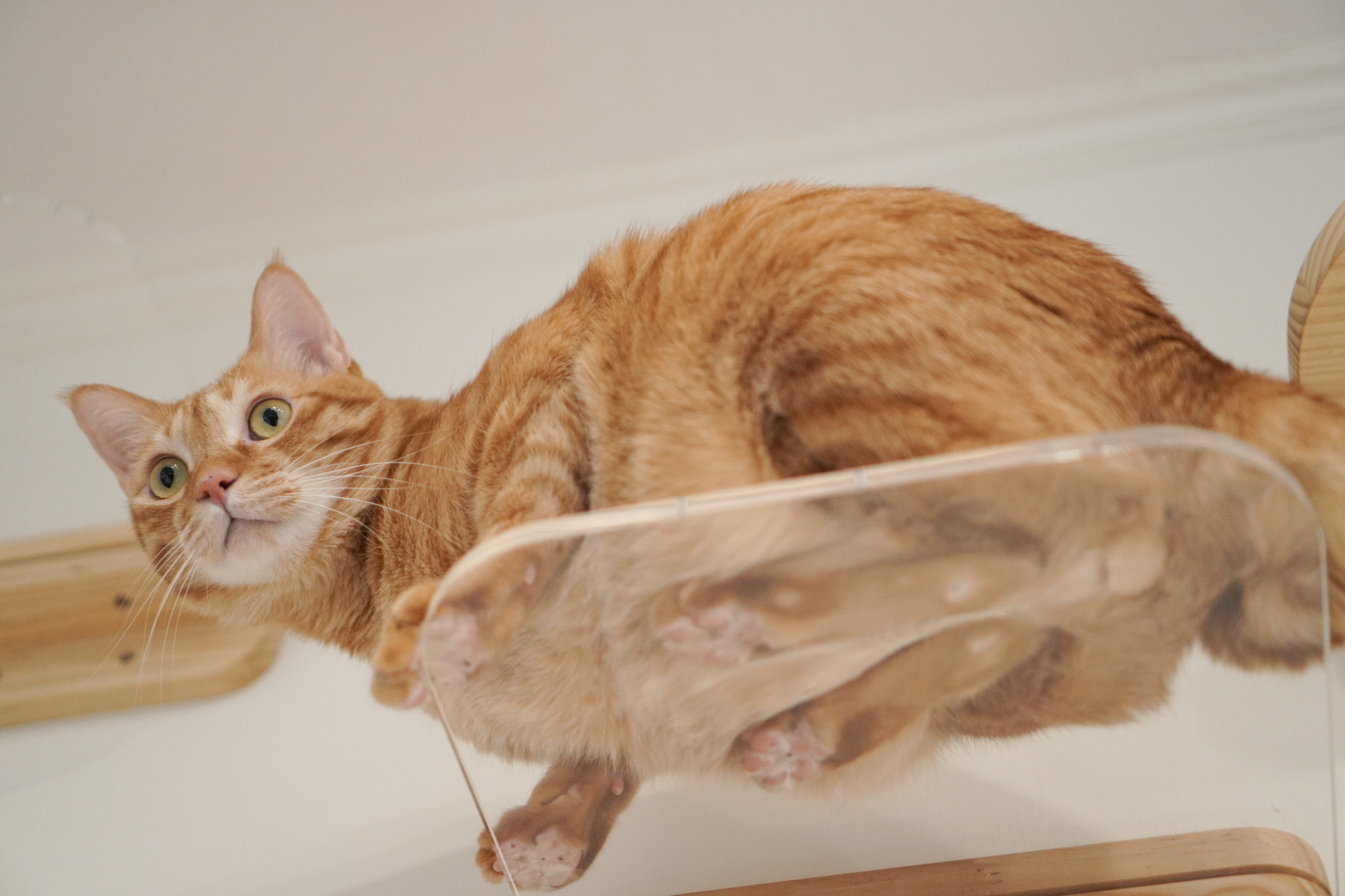 除了大家熟悉的牆壁上的跳台與貓櫃之外,更多客製了透明小踏板,滿足了主人想要窺探貓咪肉球的願望 ʕ•͡ᴥ•ʔ ,整體配置還是以增加貓咪的垂直活動空間 ,可以躲藏 、可以眺望,滿足多貓家庭 中,不同貓咪的生活習慣,讓每隻貓咪找到自己的舒適圈,更可以紓解他們的壓力哦!