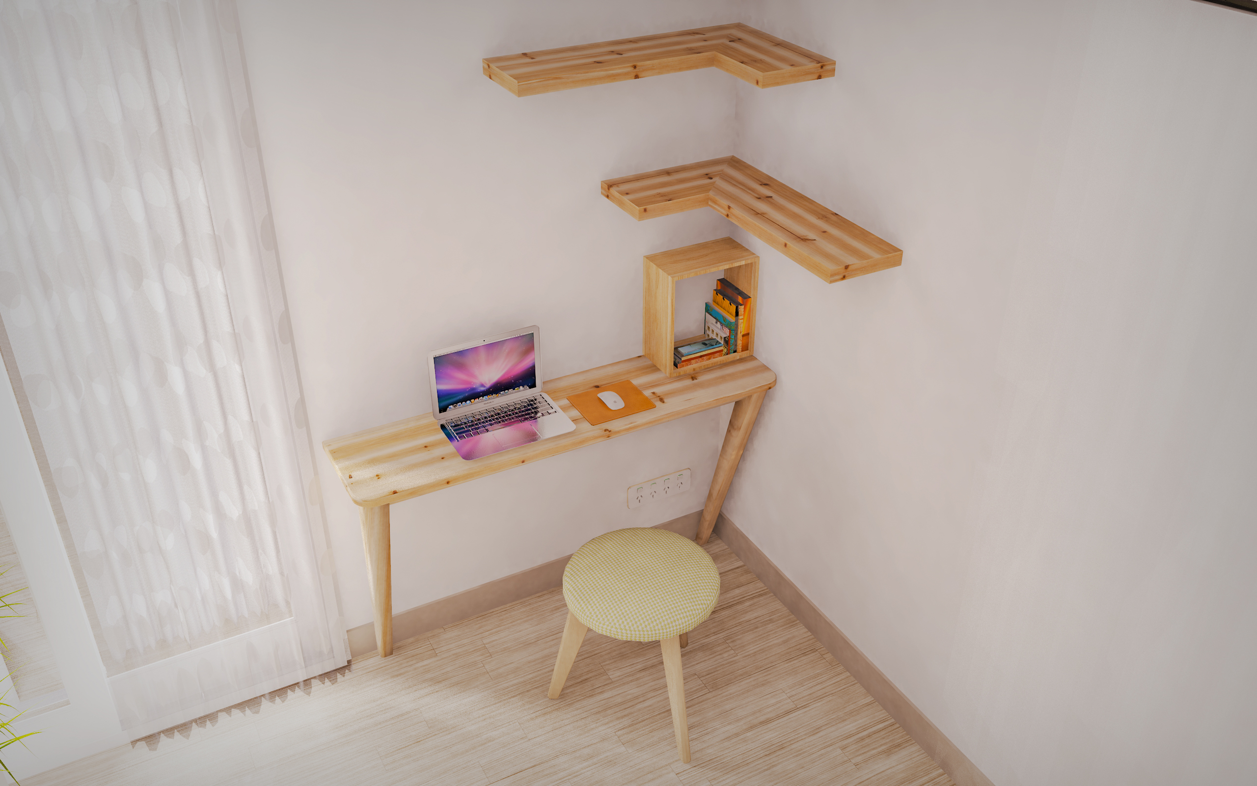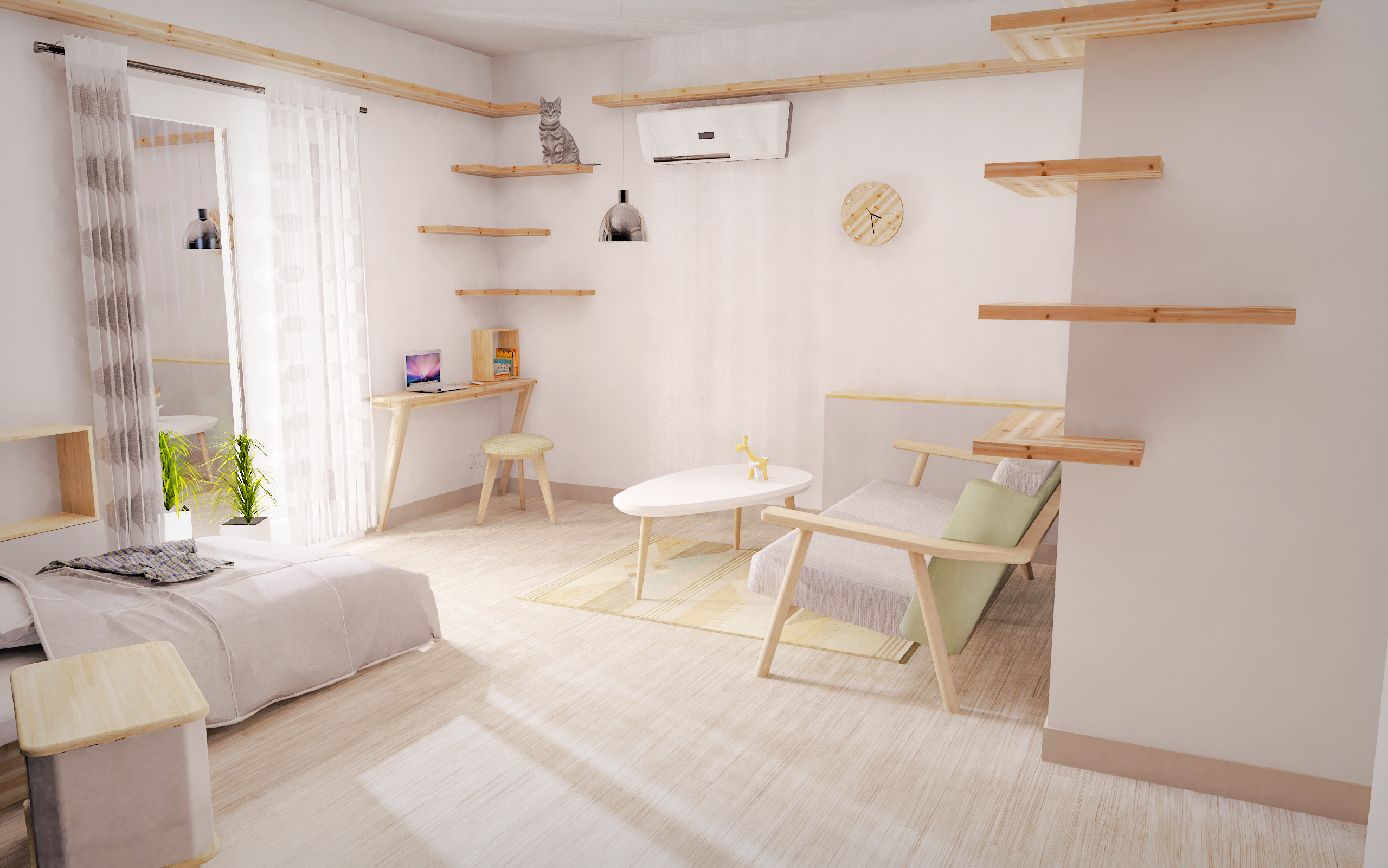 📌 貓走道層架:套房空間有限,同時業主不希望有太多的櫃類或者木工的部分,因此希望透過以牆面的走道為主要的設計範圍。同時業主可以根據貓咪的習慣(是否喜歡把東西拍落),如果貓咪會自己避開物品,層架上可以擺放盆栽、書本、香氛的物品,作為空間的裝飾與收納!