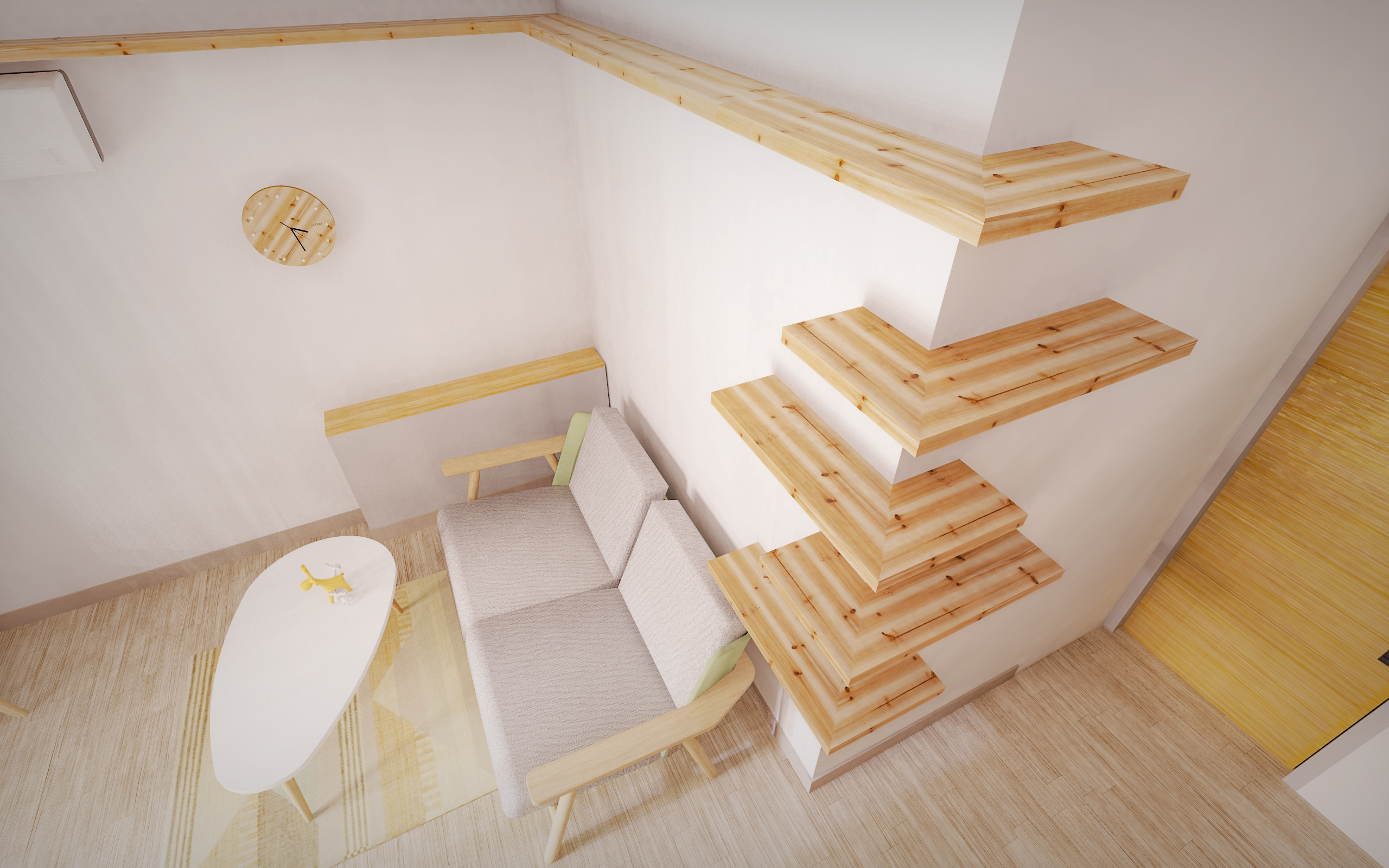 由於貓咪天性喜歡往高處去,家中最高的地方即是天花板,因此我們在靠近天花板的部分也是設計了貓走道,讓貓咪可以自由在高處移動,不僅有助於貓咪在空間中的安定感,也能夠讓他們在穿梭時感到愉悅。