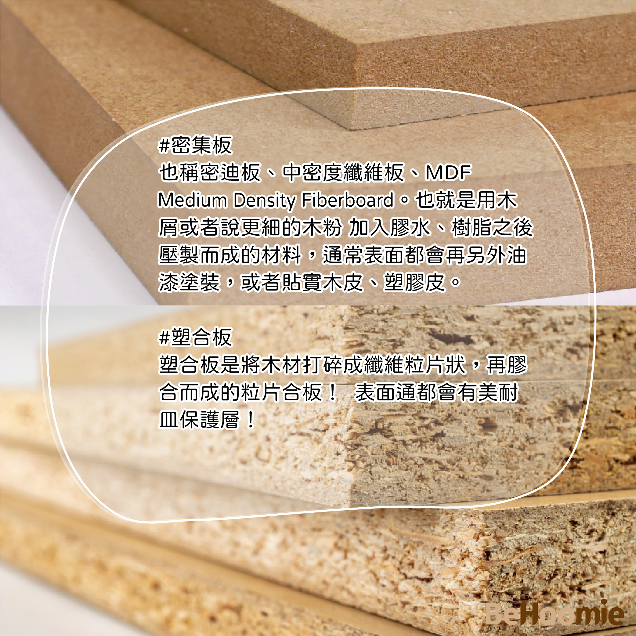 也稱密迪板、中密度纖維板、MDF-Medium Density Fiberboard。為了加速大家了解,密集;密集恐懼症的密集。也就是用 「木屑」 或者說更細的 「木粉」 加入膠水、樹脂之後壓製而成的材料,通常表面都會再另外塗裝,或者貼實木皮、塑膠皮。密集板其實也是超級常用的材料,如果大家有經驗有一些家具或者櫥櫃等等的,用久了忽然整個膨脹起來了,基本上就是密集板囉!因為表面的貼皮或者保護受到破壞,讓水分進入到材質本身,就會導致材質膨脹!