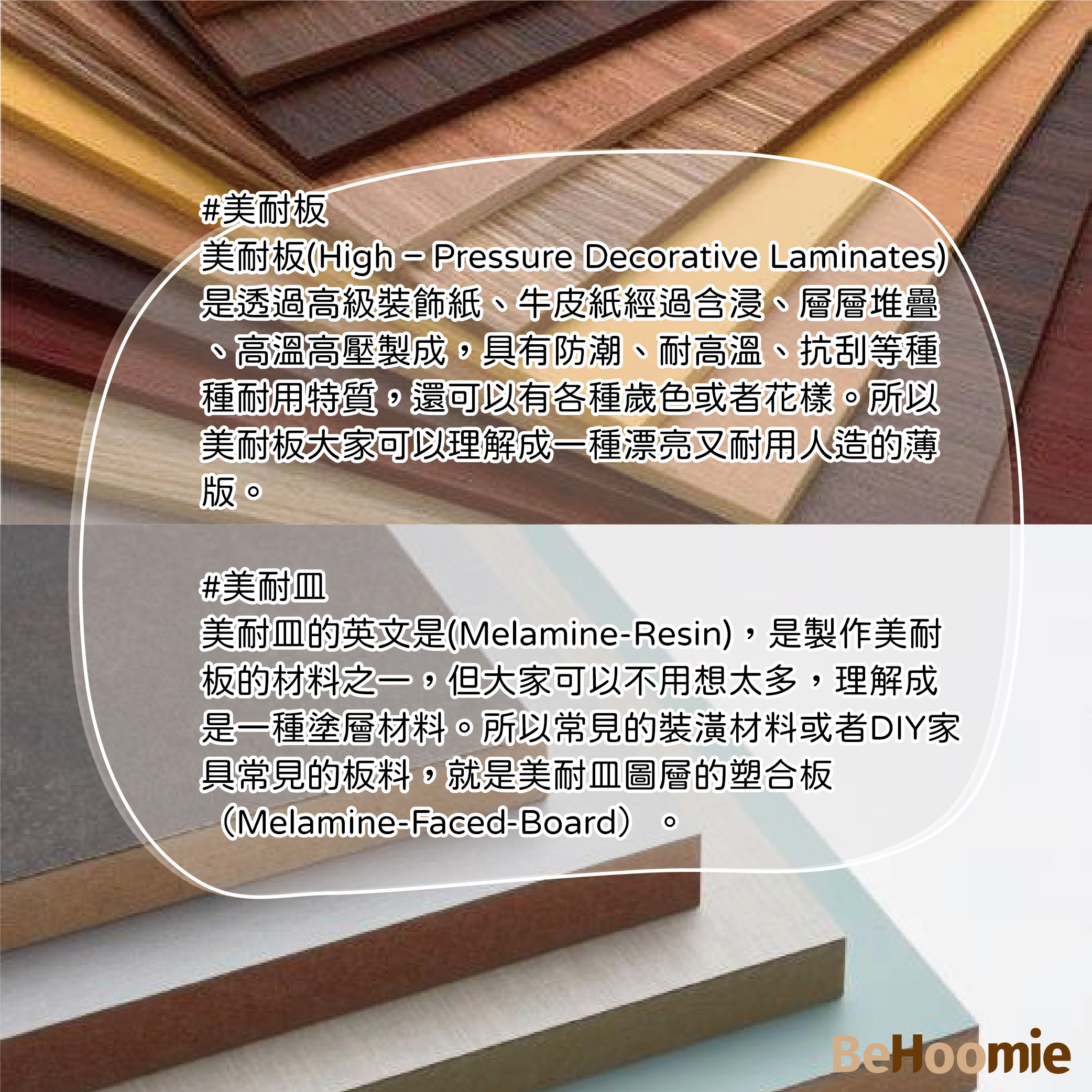 美耐皿的英文是(Melamine-Resin),是製作美耐板的材料之一,但大家可以不用想太多,理解成是一種塗層材料。所以常見的裝潢材料或者DIY家具常見的板料,就是美耐皿塗層的塑合板(Melamine-Faced-Board)。所以不會有人沒事去買美耐皿,而是去買美耐皿表層的材料囉!