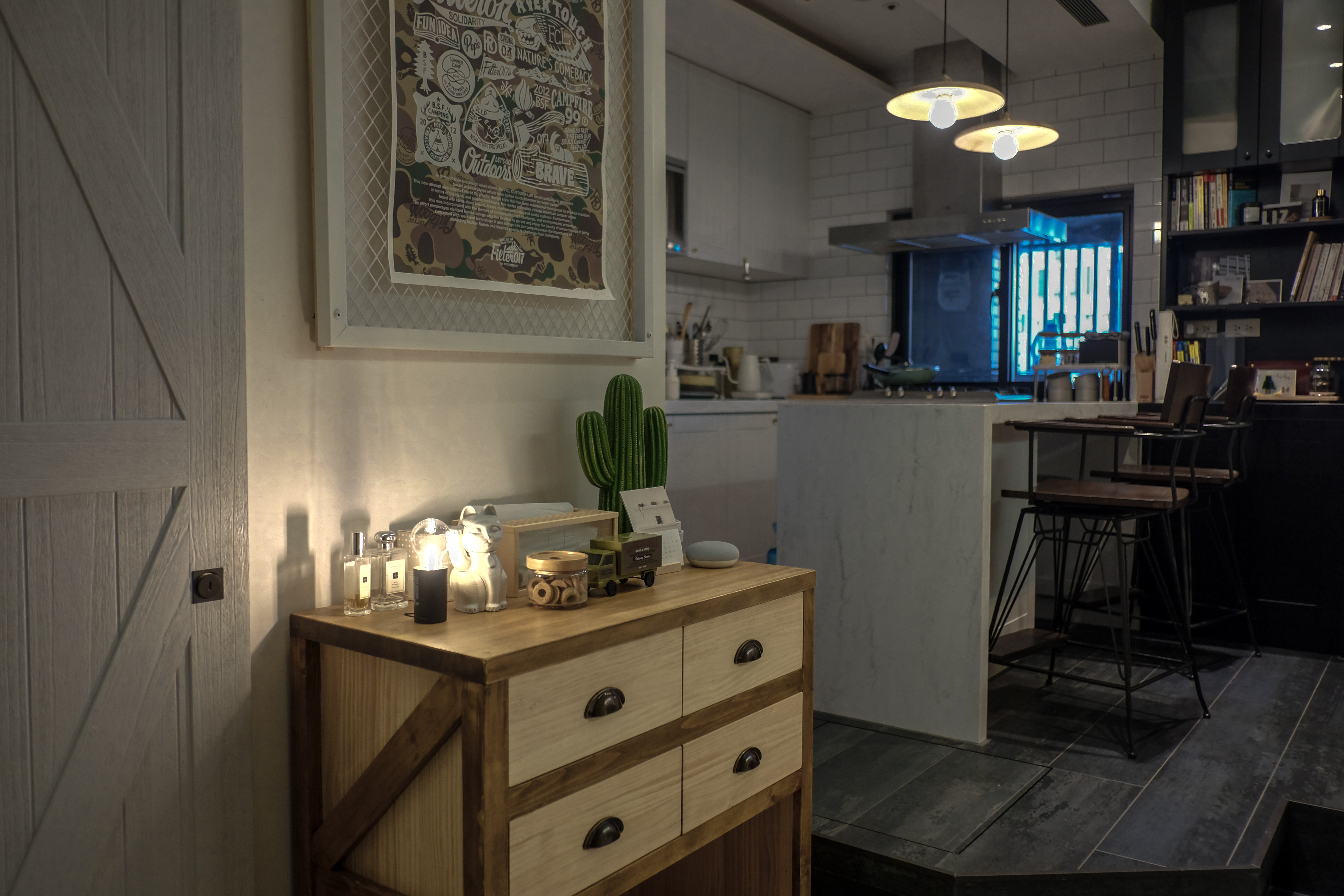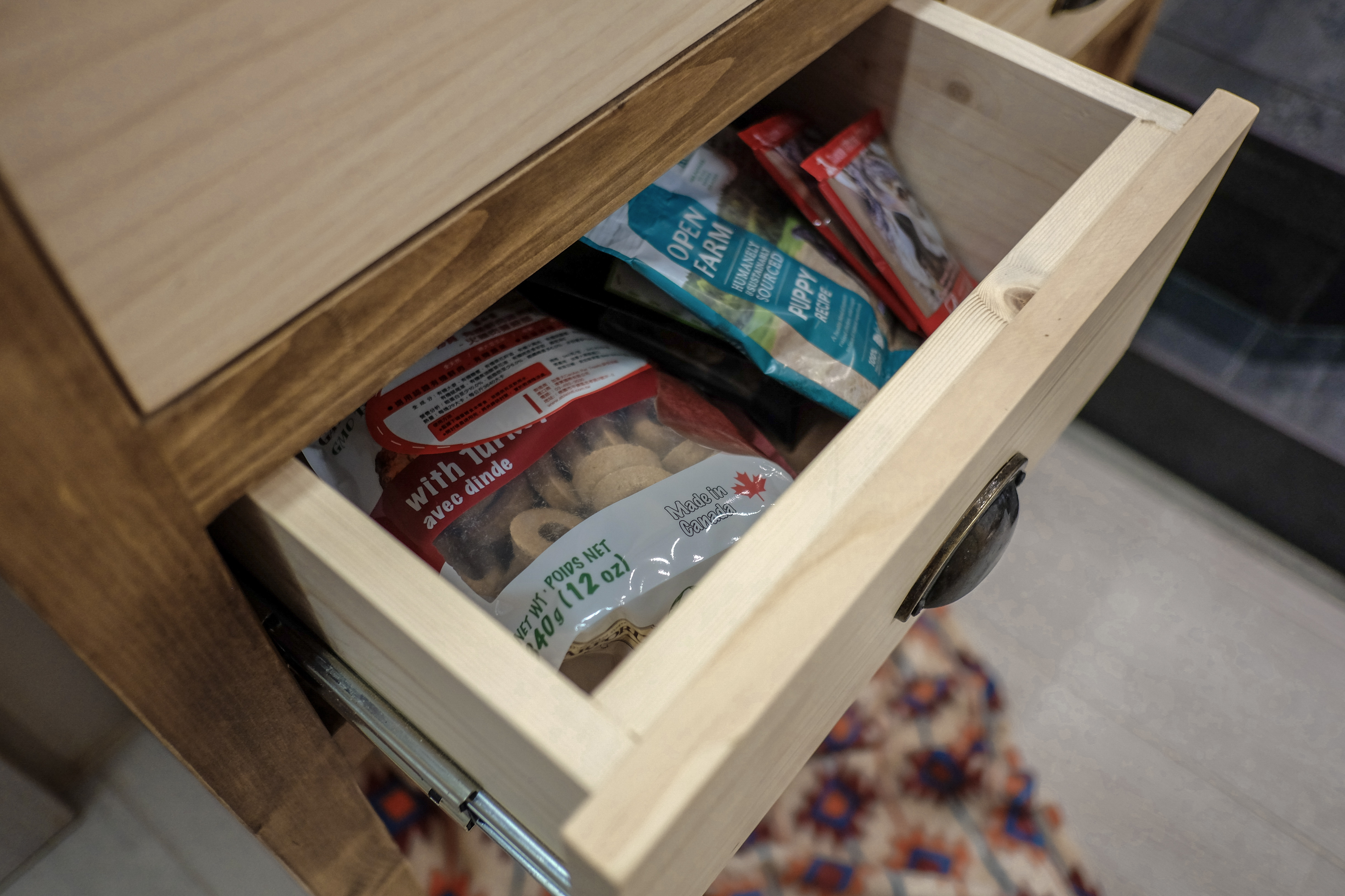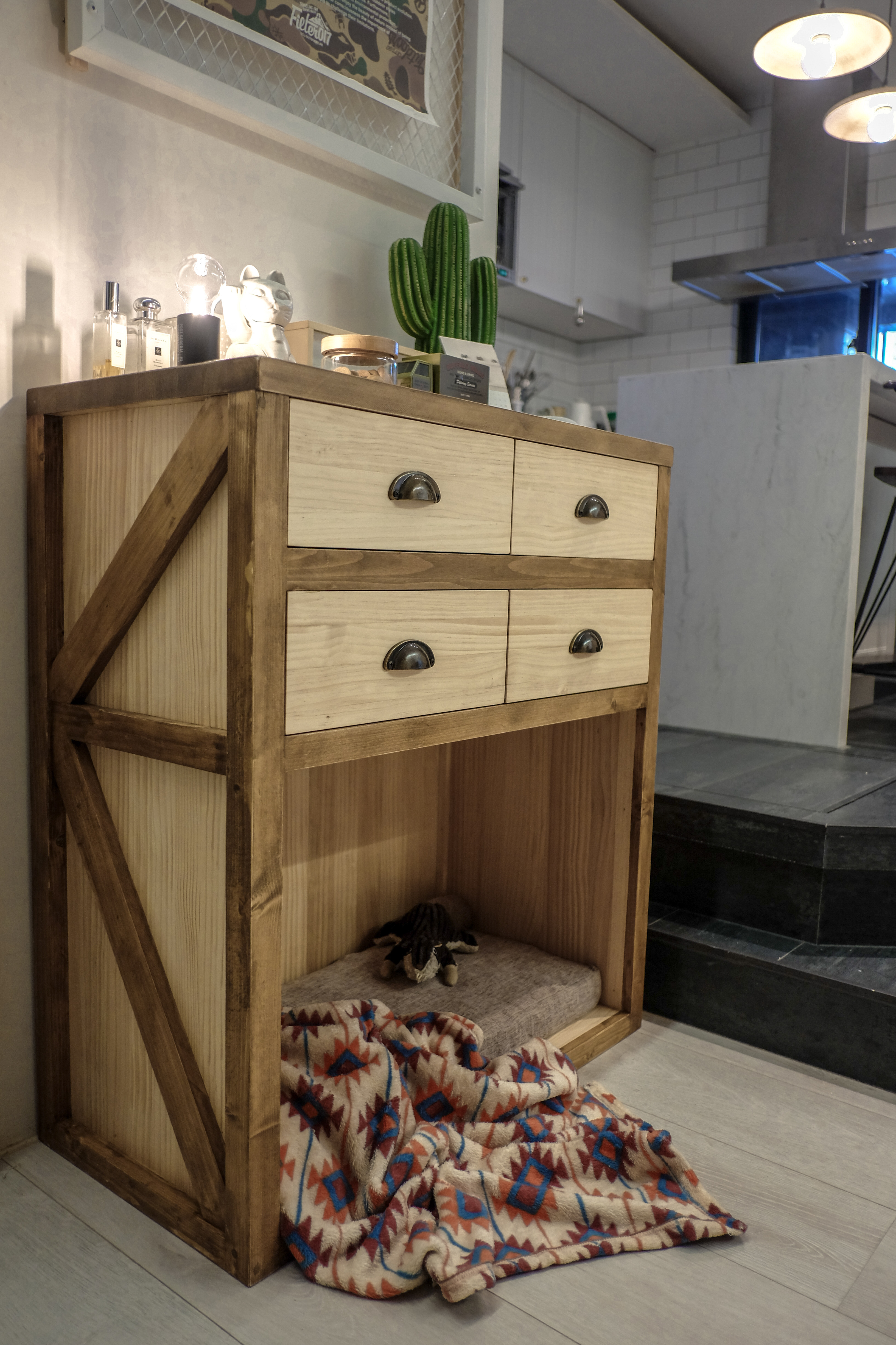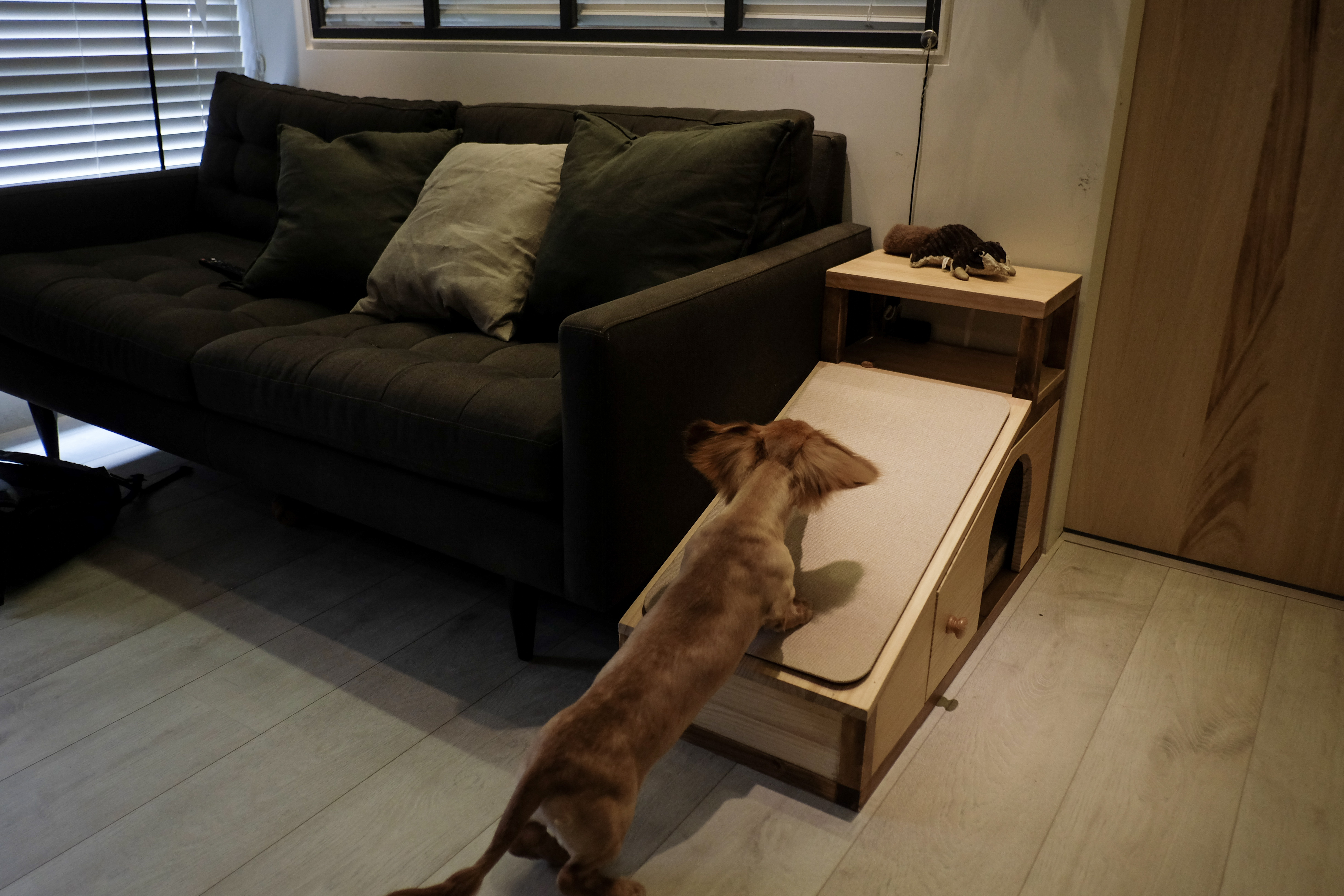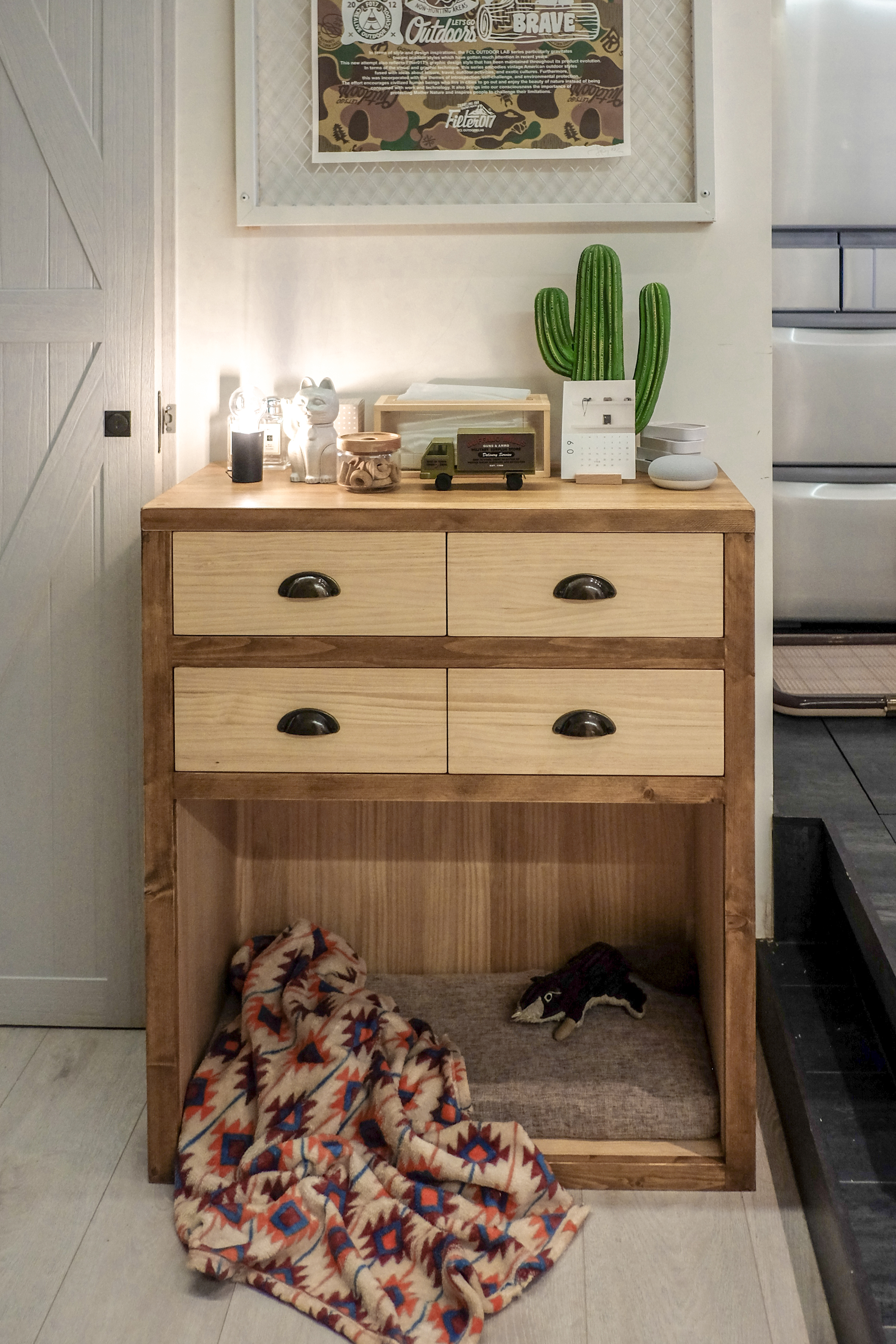 當初討論的時候,由於家裡廚房旁邊這面小牆前方即屬於家中的「閒置空間」,非常適合可以擺個櫥櫃或者矮櫃之類的,但後來就想說或許這個地方可以結合狗屋,以及收納需求,讓家裡狗狗可以「玩累了就直接睡覺」,其他的抽屜還能收納一些狗狗的零食餅乾或者玩具;機能的整合其實是非常節省空間的一個作法。