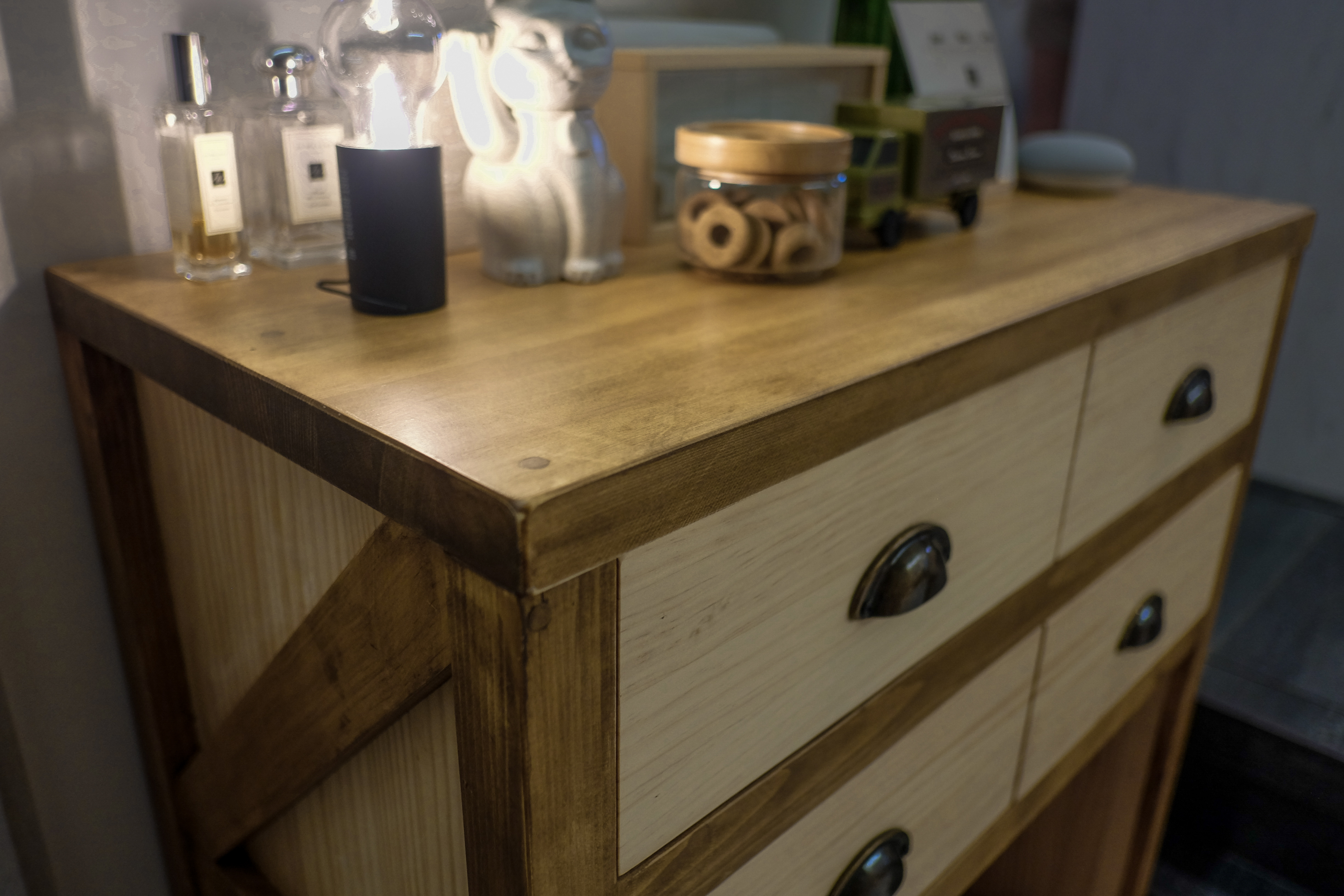 這個櫃子大家應第一眼會看到側面的穀倉門風格元素,其實也是為了呼應櫃子左邊的白色門扇的造型線條,以及家裡的整體配色。因此這邊也順便跟大家提醒,大家在購買家具的時候一定要試著想像那件家具在家裡頭的樣子,才比較不會買到跟家裡風格不搭的東西囉~ 第二則是我們都是以較為樸素、粗獷的方式去設計,塗裝的方式亦讓家具可以表現出 outdoor 的自然樸實的感受,而非精緻細膩的線條。